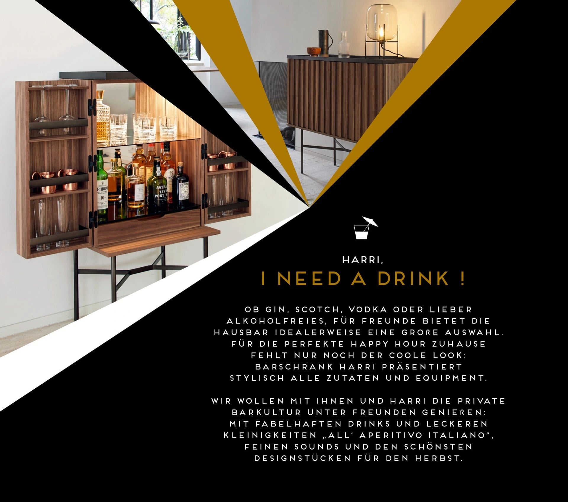 Who actually is HARRI? Quite simply, the latest design coup from the Hamburg-based luxury manufacturer [more]. With the HARRI bar cabinet made of walnut wood, happy hour starts with the mixing: The powder-coated steel shelf has enough space to prepare drinks. The drawers and compartments in the discreetly illuminated interior provide space for equipment. HARRI's doors can be opened to the maximum and are equipped with holders to store tumblers, long drink glasses or cocktail glasses within easy reach.