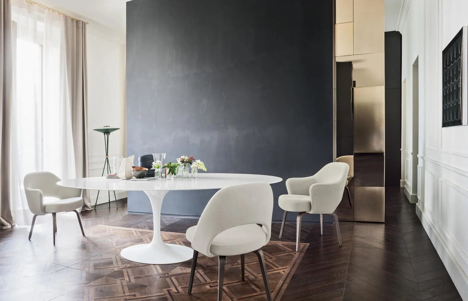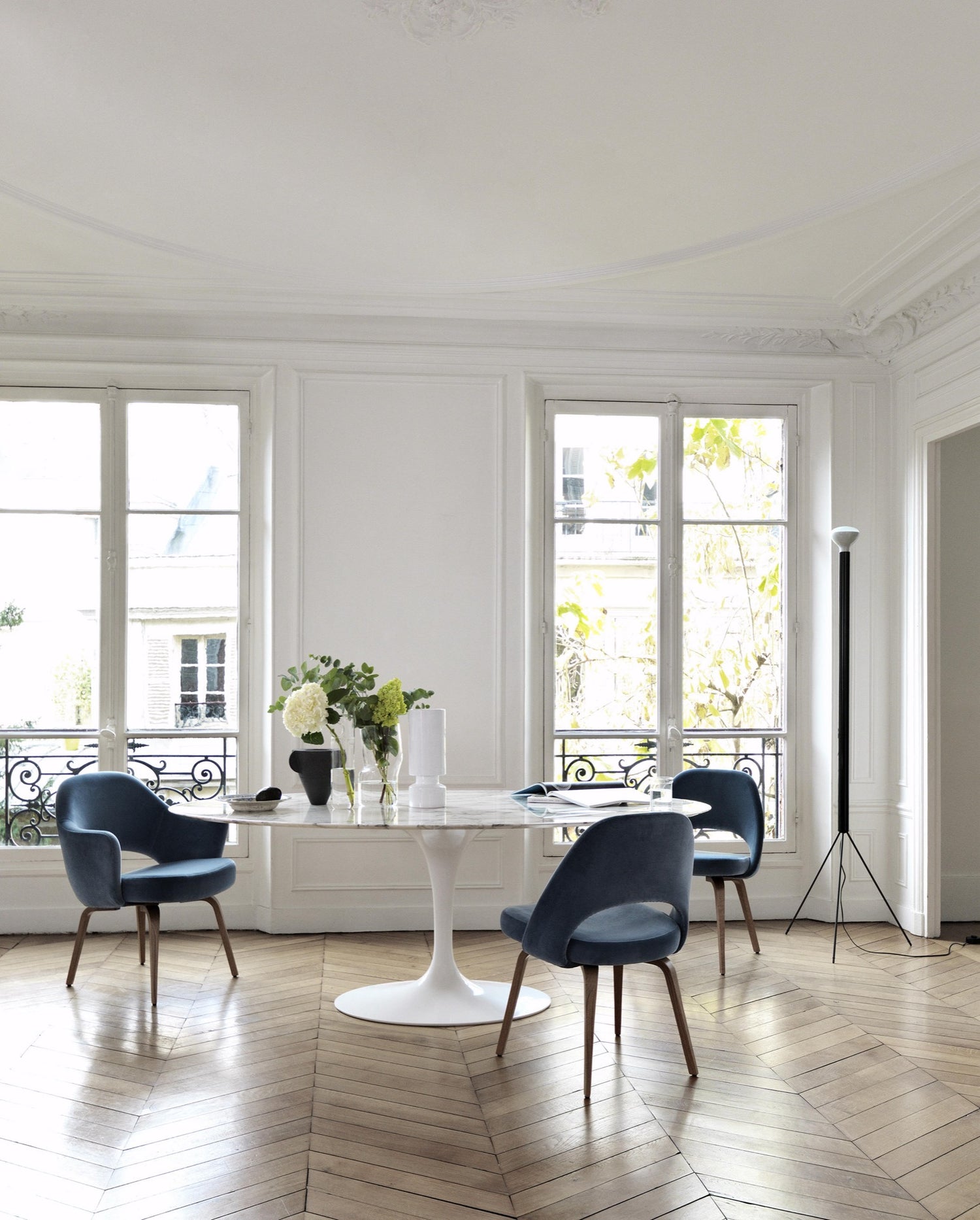 To achieve this, true-to-scale model furniture was built and arranged in a space the size of a dollhouse to find the ultimate form. Supported by the Knoll Design Development Group, the Saarinen pedestal concept was functionally perfected, realized, and introduced in 1958. The table is a best-seller for Knoll International and is displayed in its finest form at Der neue Beckmann in Hamburg, featuring a top made of Arabescato marble, in a matte finish. Welcome home!