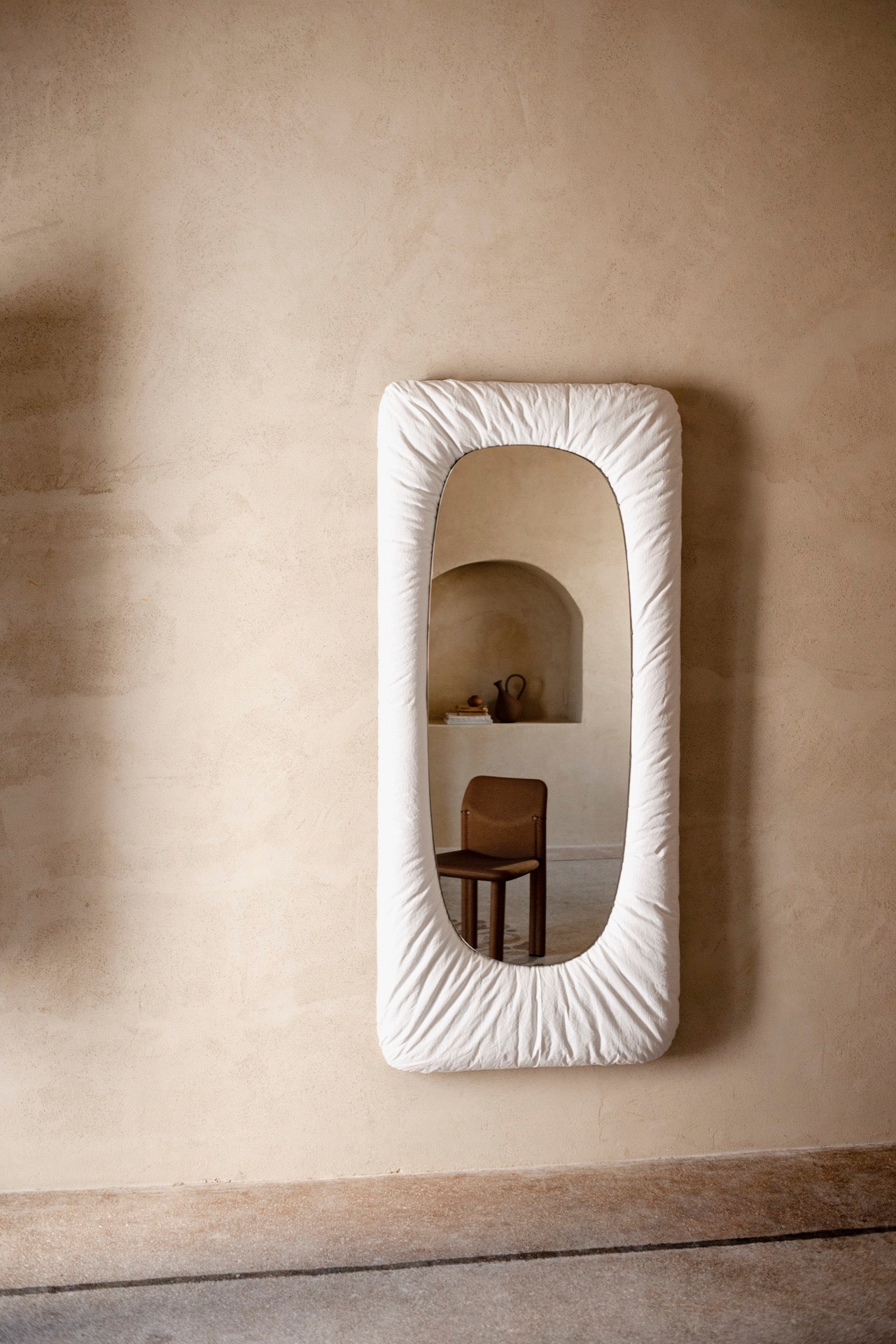 Stellar has the appearance of a mirror buried in a cushion. Designed by Faye Toogood, Stellar reflects the materials and forms used throughout Cosmic – the studio’s collaborative collection with Tacchini. Faye Toogood’s disruptive energy takes Tacchini’s trademark upholstery and stuffs it in unexpected places. Here, the hard and shiny surface of a mirror is couched in a puffy, tactile frame.