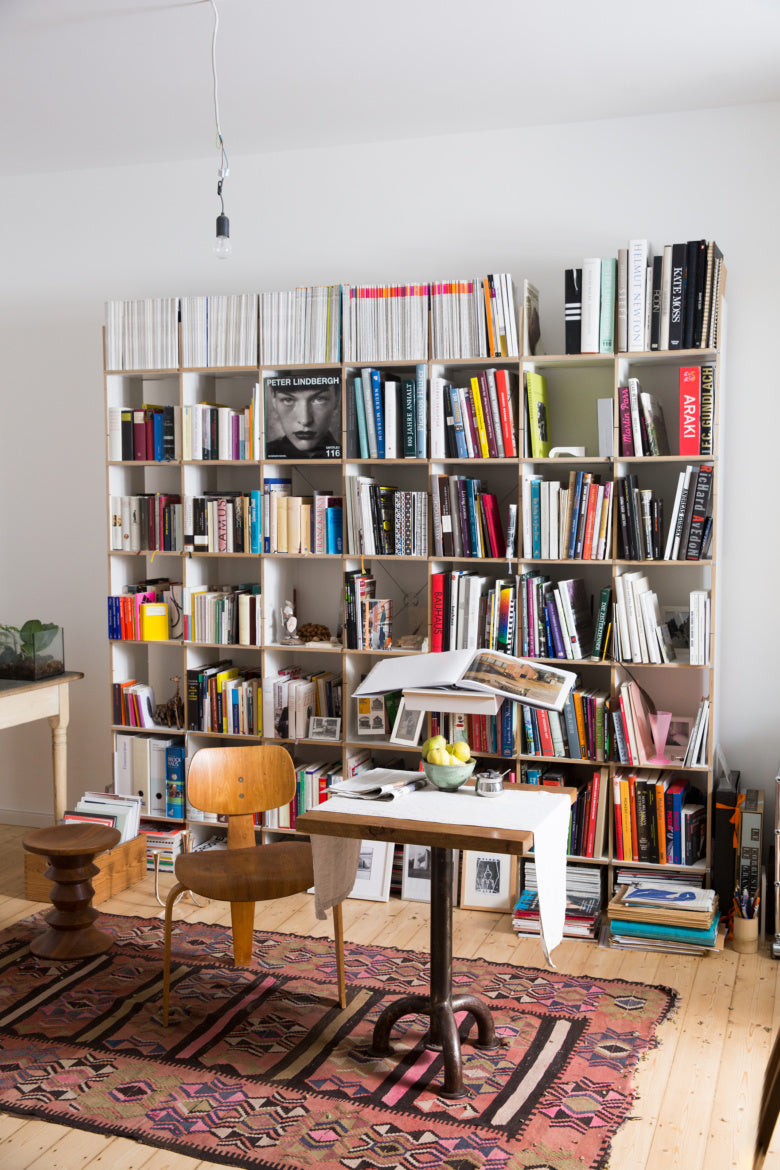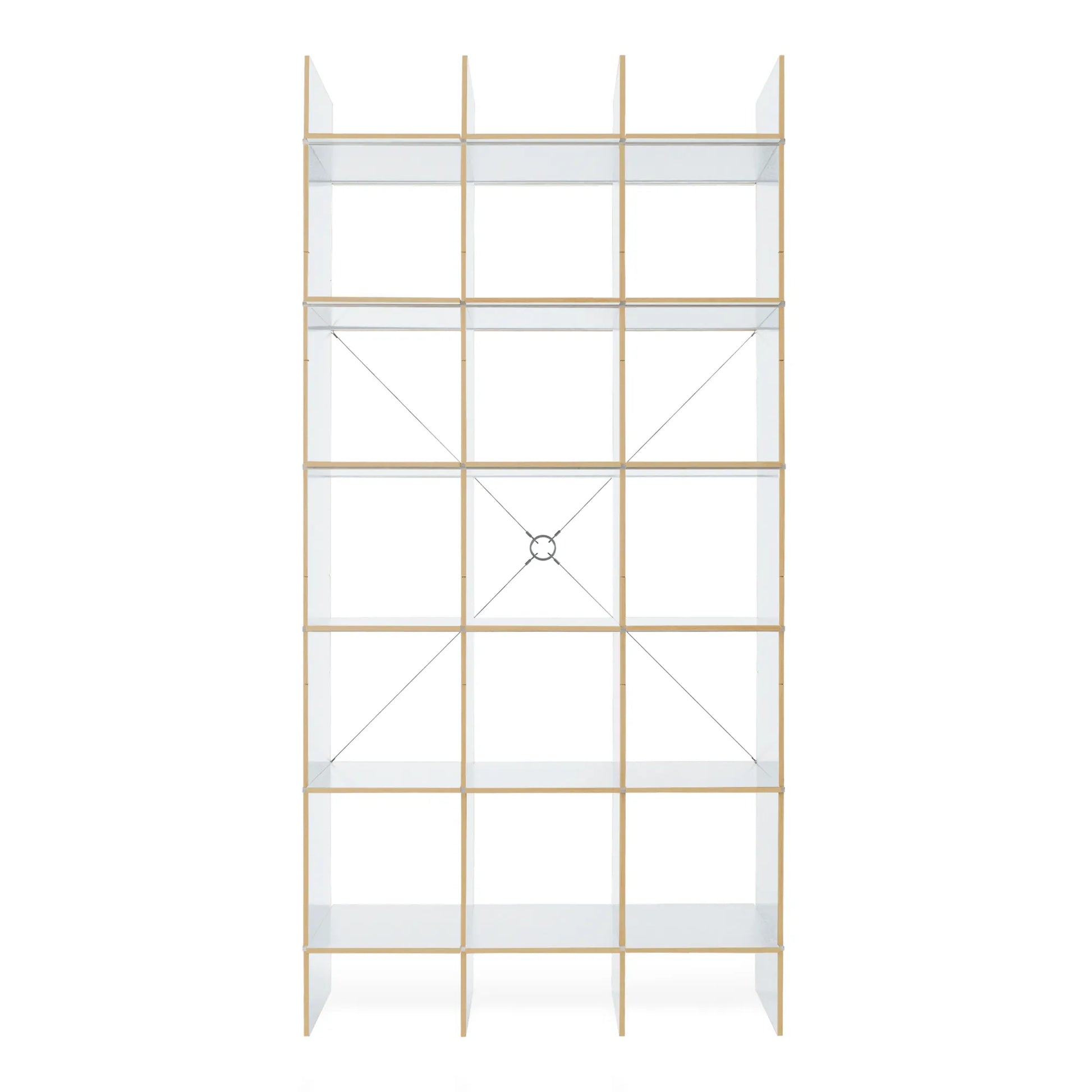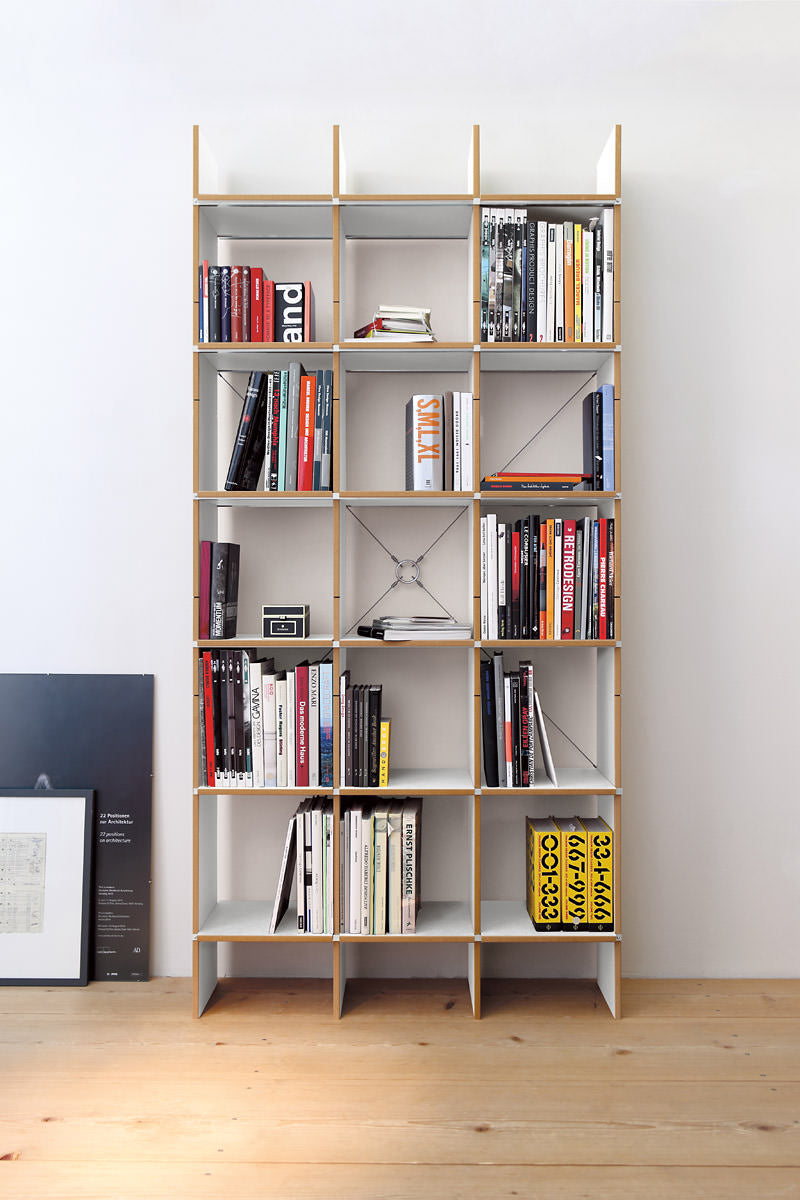 Side holds rail. Rail holds floor. Bottom holds rail. Rail holds side. Thanks to its simple and intelligent design, the shelving unit can hold a maximum of contents with minimum material thickness and can be adapted to many room situations. Sometimes it follows sloping ceilings, sometimes it stands freely in the room, other times the FNP leaves a cut-out for large screens or windows with views. Corner solutions are just as feasible as door superstructures or a room within a room.