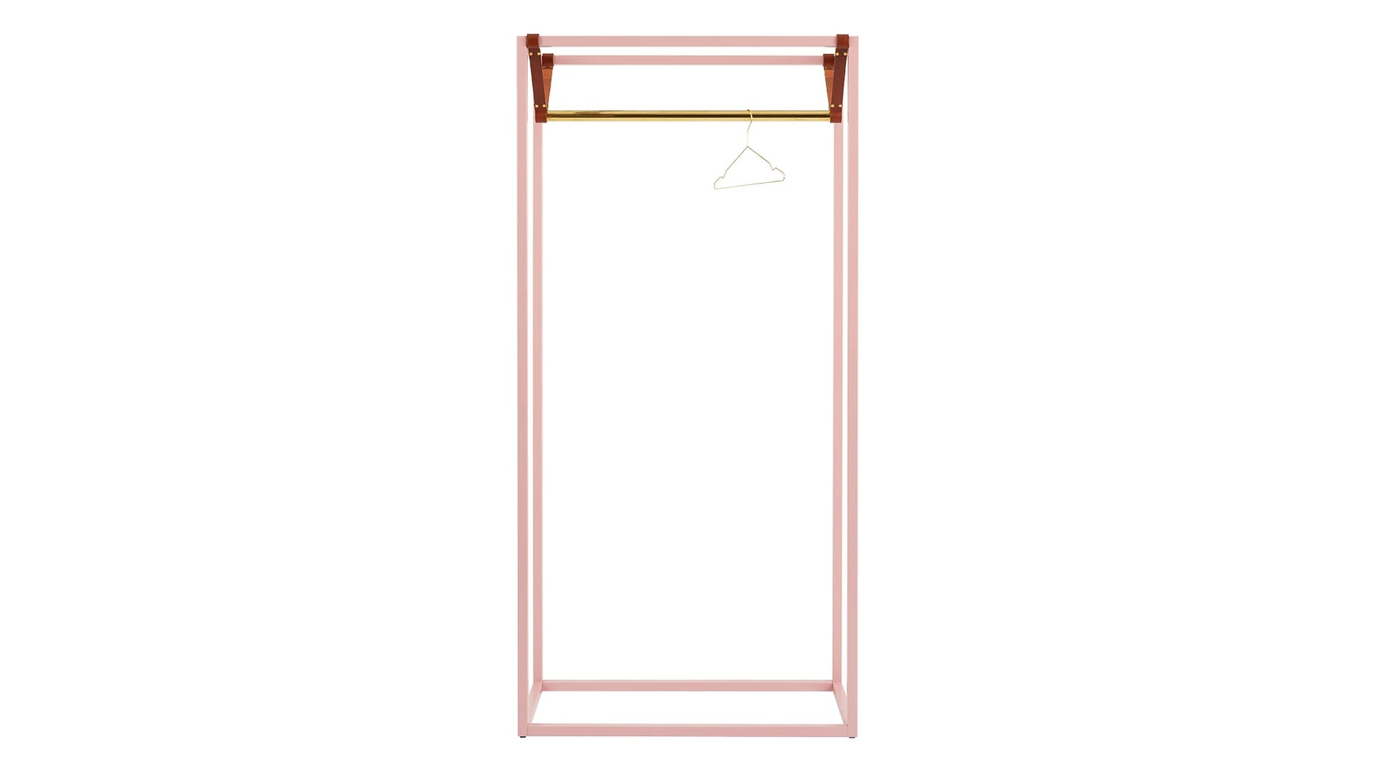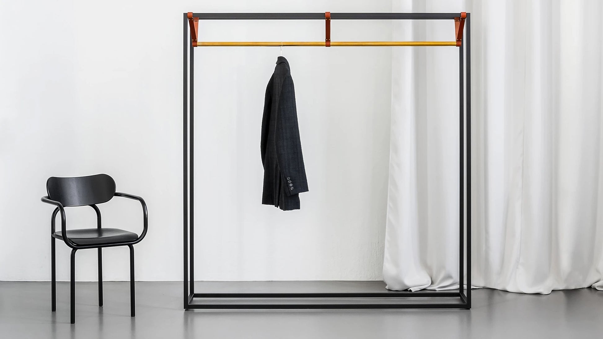 LESS MESS doesn’t hide clothes behind doors but showcases them openly in the room. As its name suggests, the wardrobe strives to maintain order and limit chaos. LESS MESS combines the functions of a clothes rail and wardrobe and puts the clothes in a threedimensional frame. Metal bars, arranged strictly at right angles, contrast deliberately with soft leather straps that suspend the brass clothes rail. The slim silhouette also benefits those who move house frequently. Six powdercoated square tubes form the basic construction of this piece. Screwed together, they are so robust and resilient that they can become companions for life. Over time, the brass and leather elements develop a soft tarnish, contributing to the everchanging individual character of LESS MESS. Designed and manufactured in Hamburg.
