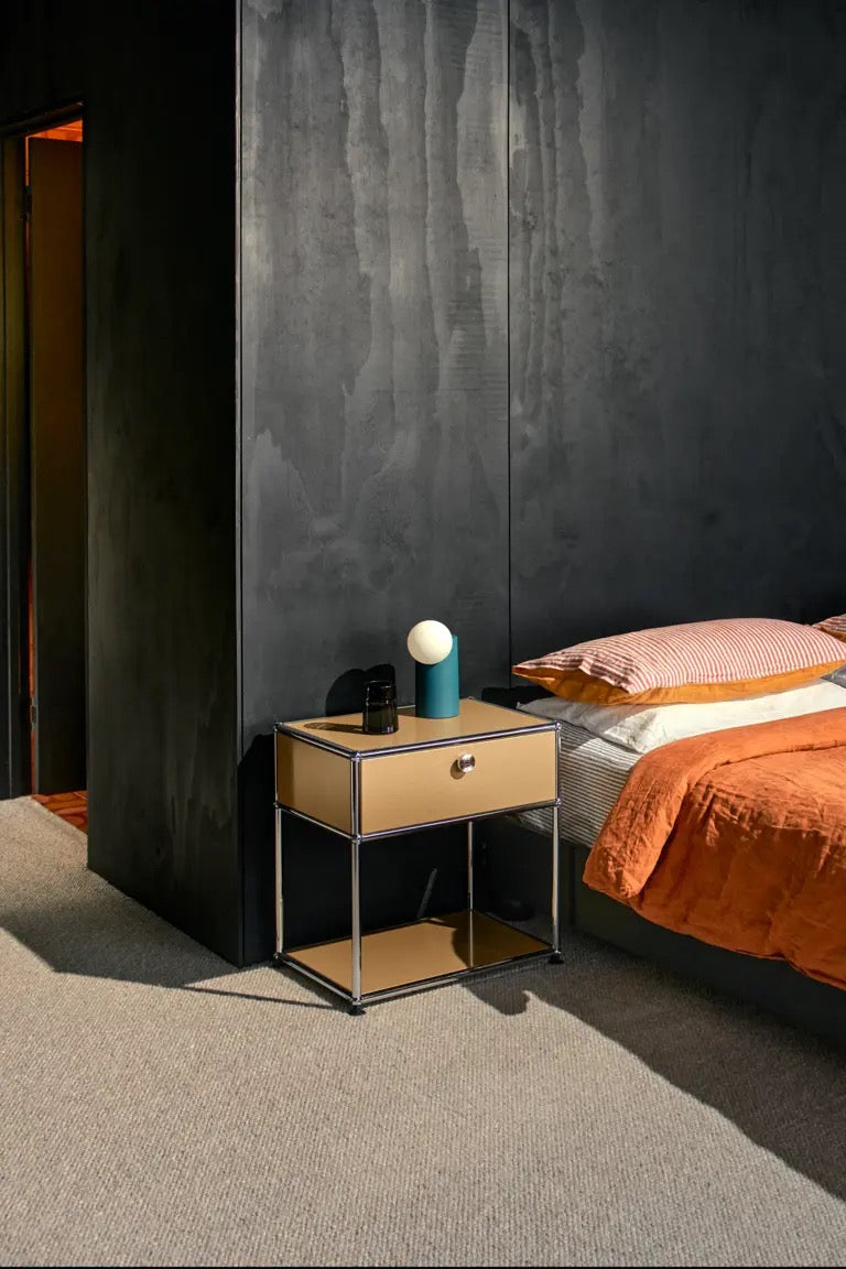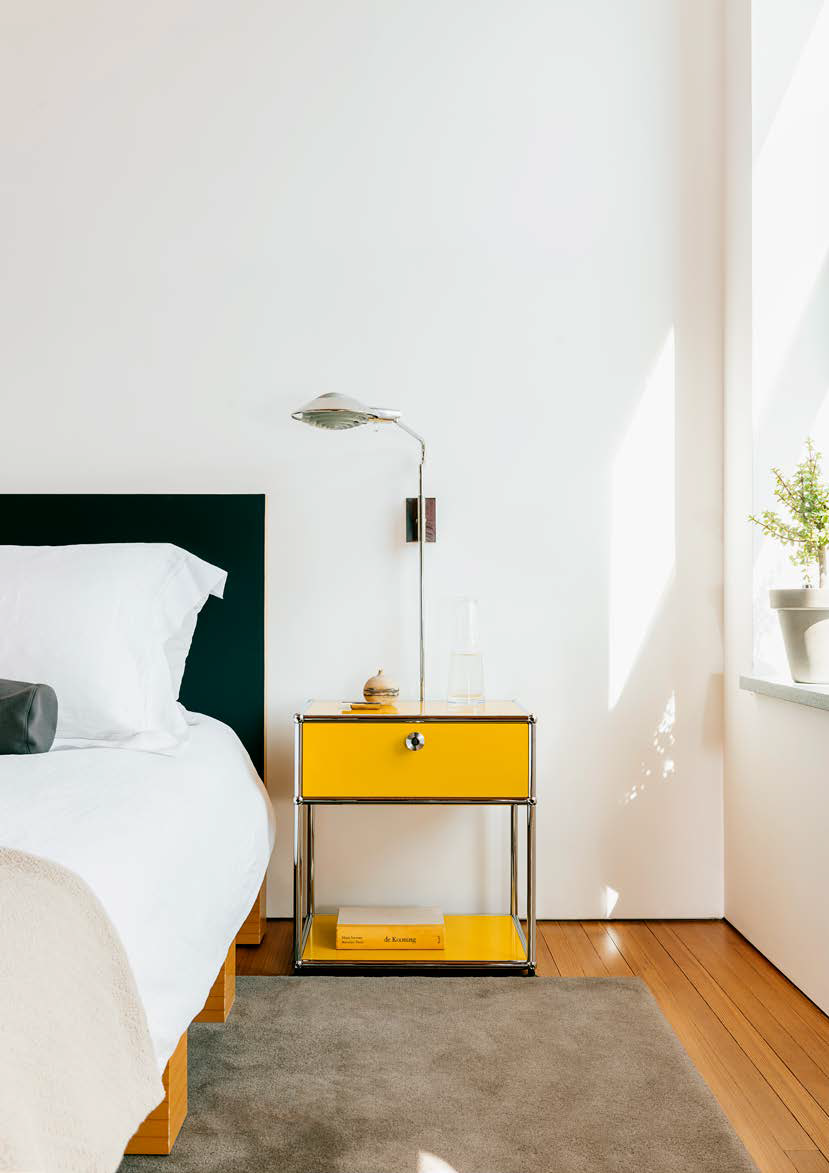 Small but mighty. This very minimalist USM furniture exudes elegance and simplicity. It cuts a fine figure both as a bedside table and as occasional furniture. Behind the flap door, you can store anything you don't want to be seen.