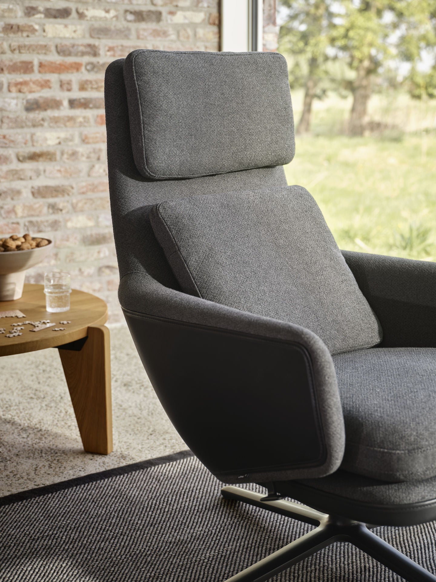 Grand Relax is a luxurious reclining lounge chair combining outstanding comfort with compact dimensions and a classic understated aesthetic. When sitting down, the user sinks into the soft cushions, and the chair reclines thanks to an integrated and adjustable synchronised mechanism concealed within the seat. The backrest can be locked in any position. The outer backrest is covered with embossed split leather, forming a type of shield that enfolds the user, while defining the contours of the lounge chair. Grand Relax appears both compact and inviting.