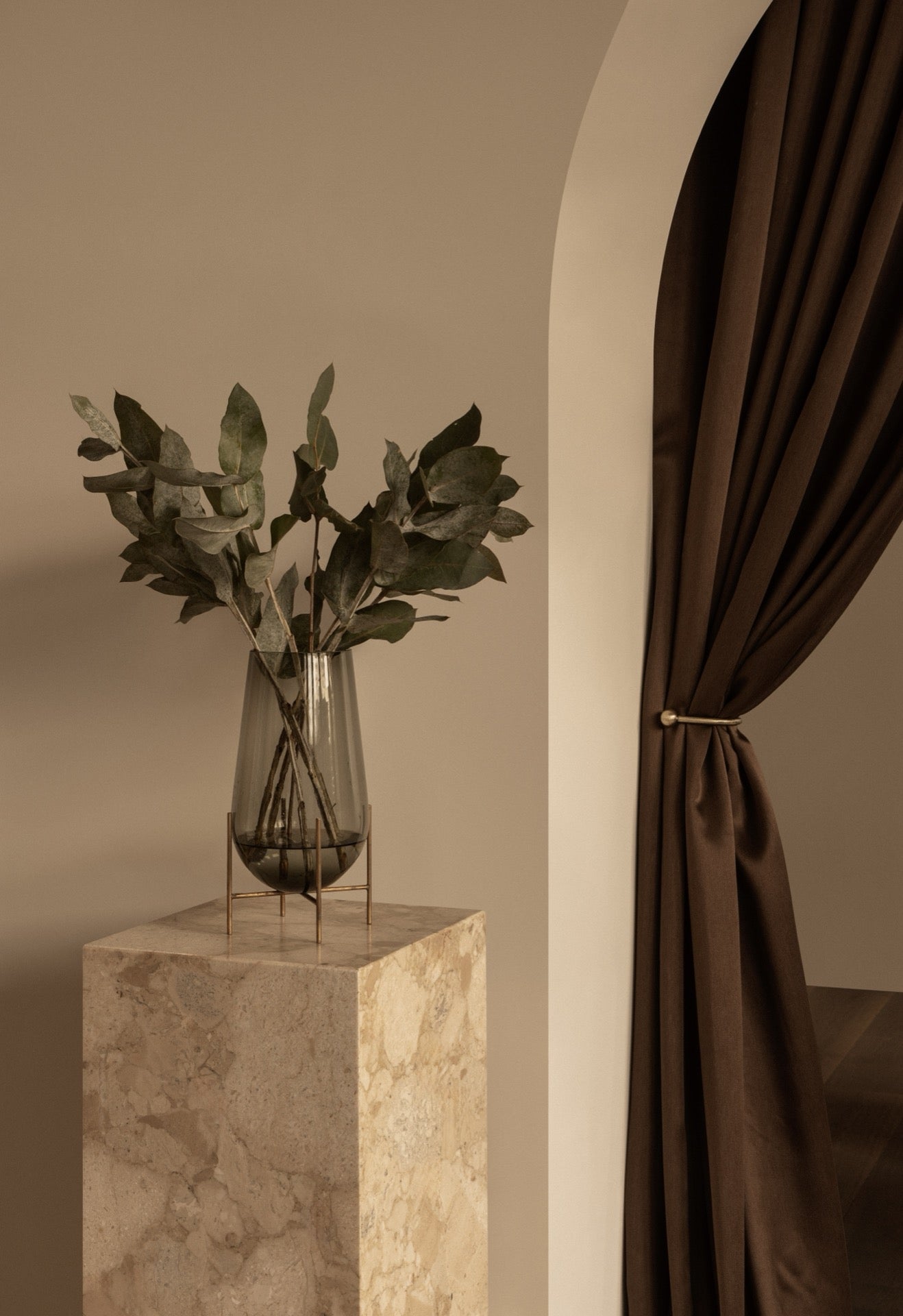 Die Échasse-Vase-Das erste Stück der inzwischen ikonischen Kollektion wurde von Laborreagenzgläsern inspiriert. Die tropfenförmige Form wirkt ebenso elegant, wenn sie Blumen auf dem Schreibtisch oder im Wohnzimmer aufbewahrt, oder wenn sie ungefüllt bleibt. Die Rauchglasversion mit gebürsteten Messingbeinen ist in drei Größen erhältlich. Die einzigartigen Farbverläufe des Glases verleihen dem Design Tiefe und kontrastieren mit den klaren Linien der Beine. Die kleinste Vase ist jetzt auch mit klarem Glas und bronzierten Messingfüßen erhältlich - eine klassische Kombination, die jede Inneneinrichtung ergänzt, und in einer Größe, die ideal für kompaktere Räume ist.