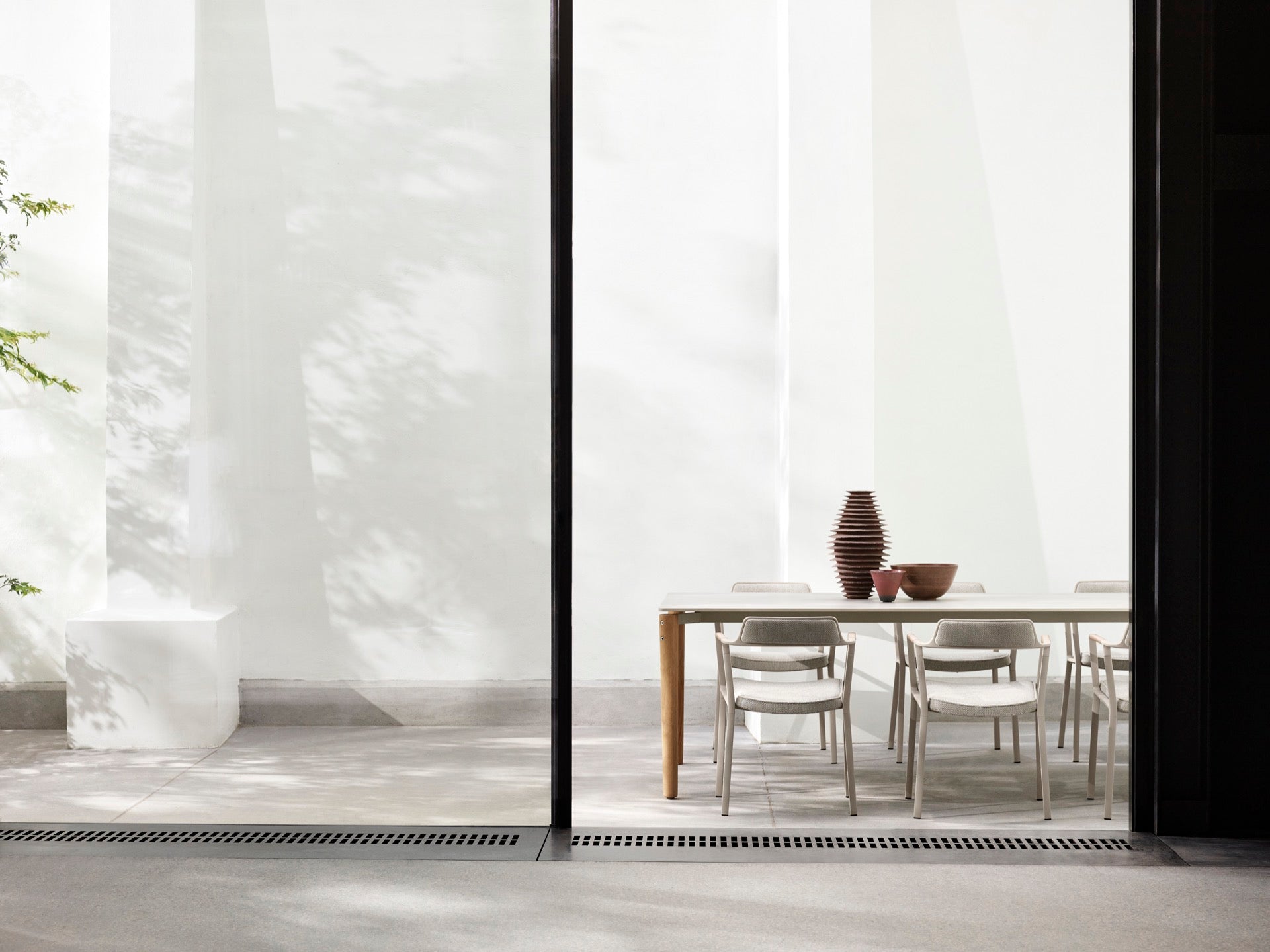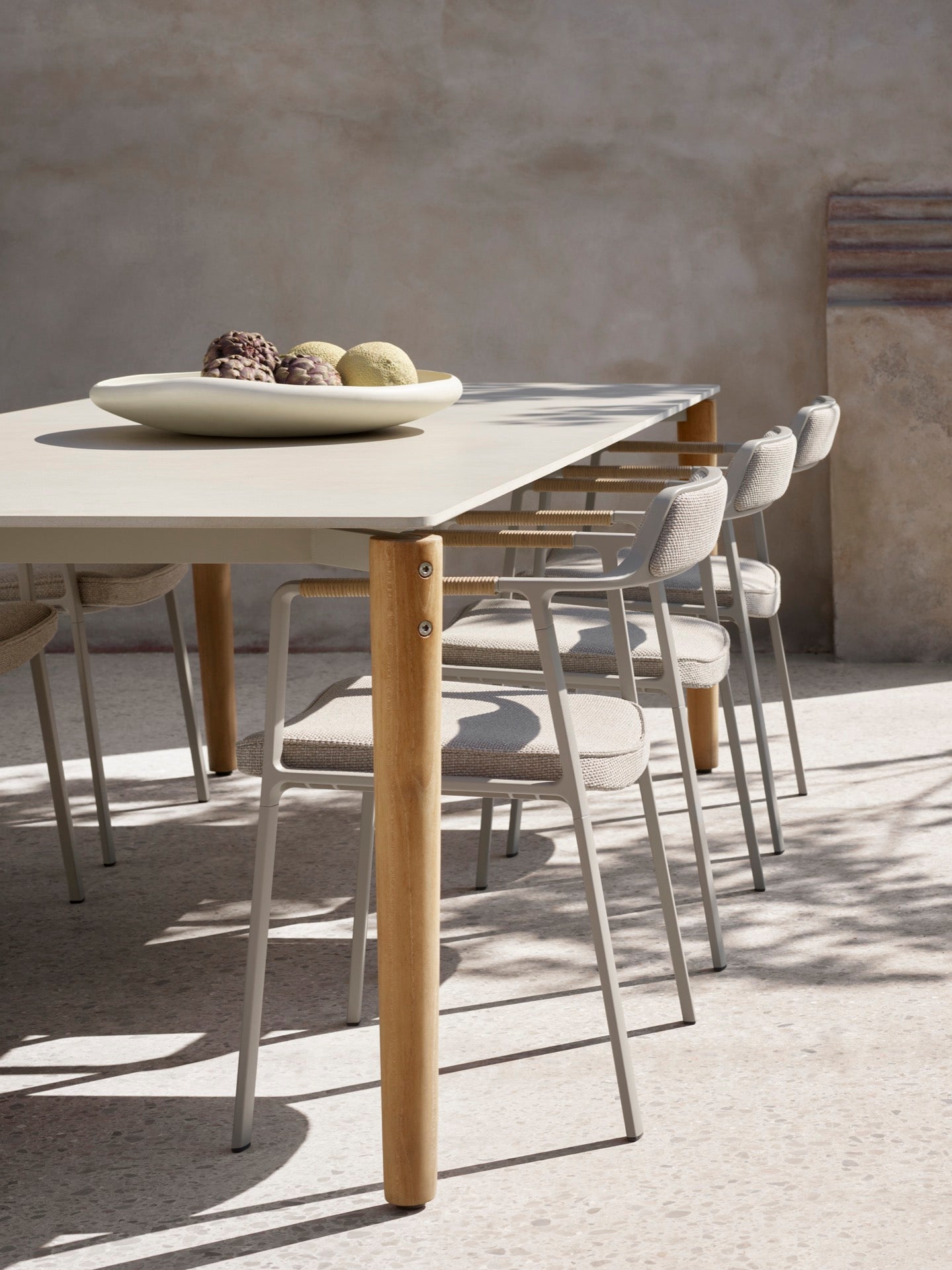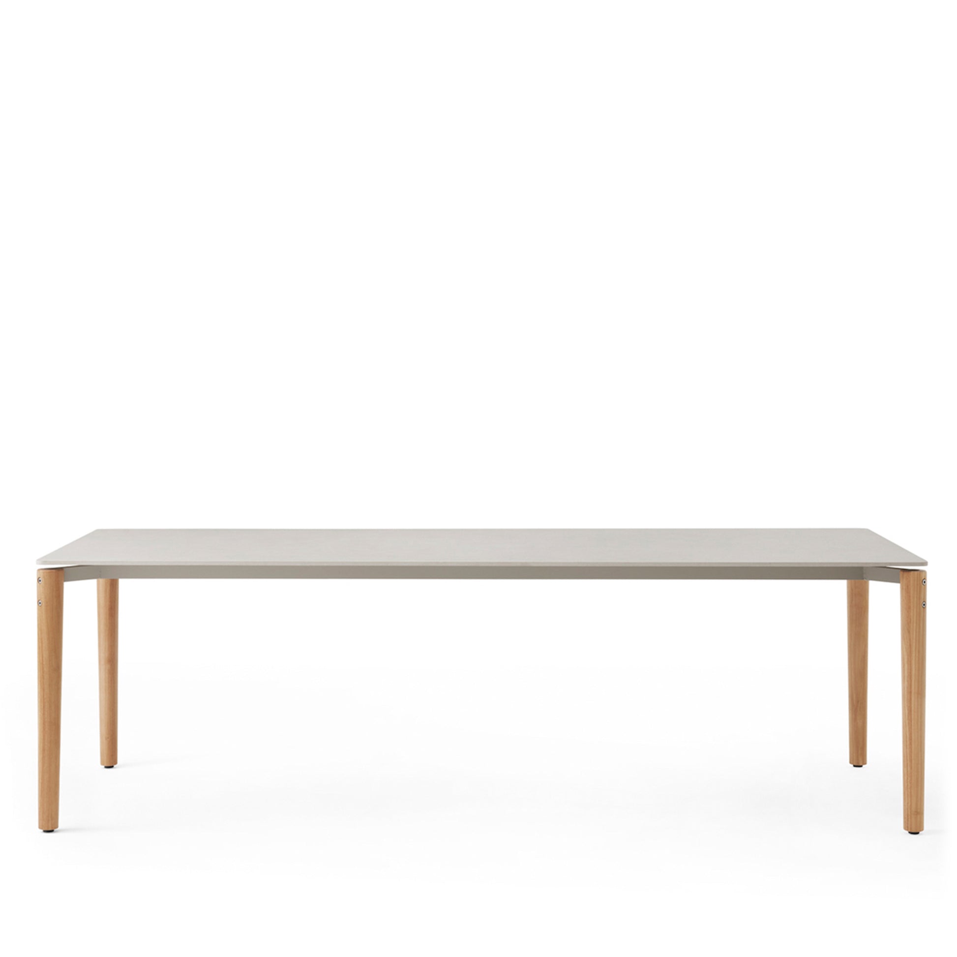 Der Vipp Outdoor Table ist 2,5 Meter lang und besteht aus einem Aluminiumrahmen mit einer 12 mm starken Keramiktischplatte. Die Beine sind aus Teakholz. Unter jedem Bein befinden sich kleine verstellbare Füße, mit denen die Höhe des Tisches je nach Untergrund angepasst werden kann.V