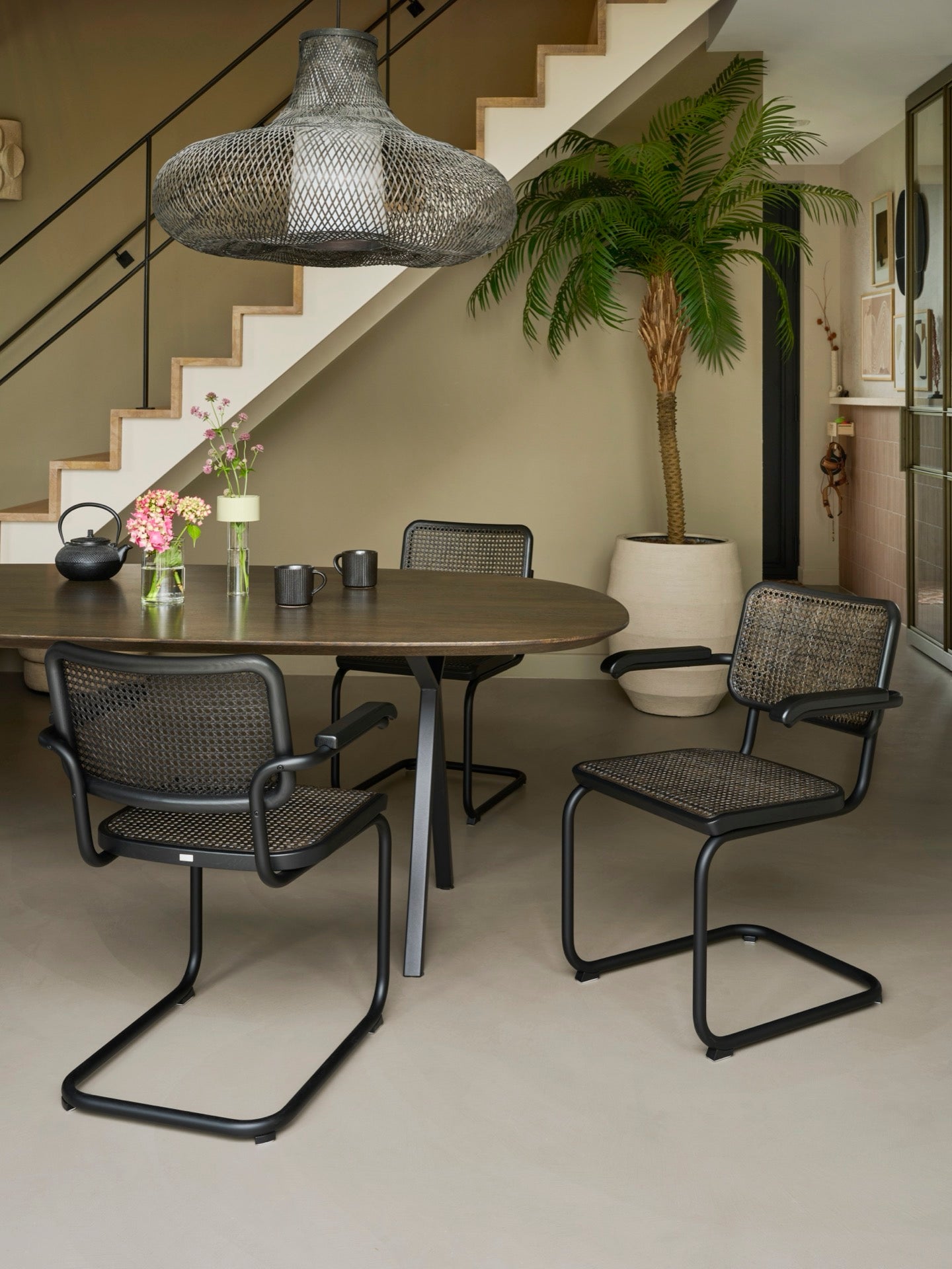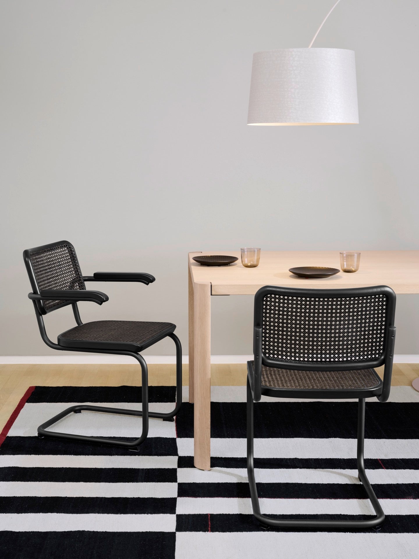 Unter den Stahlrohrmöbeln ist der Freischwinger S 64 V besonders vielseitig. Er ist in unterschiedlichen gestalterischen Welten zu Hause. Zur kompromisslos modernen Einrichtung passt er genauso wie zum vielseitigen Mix, der unterschiedlichen Epochen und Stilen nebeneinander Raum gibt. Der Freischwinger S 32 V und die Variante S 64 V mit Armlehnen sind die bekanntesten Stahlrohr-Klassiker. Zu ihrer Popularität trägt die reizvolle Verbindung des Neuen mit dem Bewährten bei: Die Thonet-Tradition in der Herstellung von Bugholzmöbeln mit charakteristischem Wiener Geflecht in Kontrast zum revolutionären Einsatz von Stahlrohr. Sitz und Rückenlehne aus Massivholz mit Rohrgeflecht verkörpern Tradition, das Gestell Gegenwart und Zukunft.